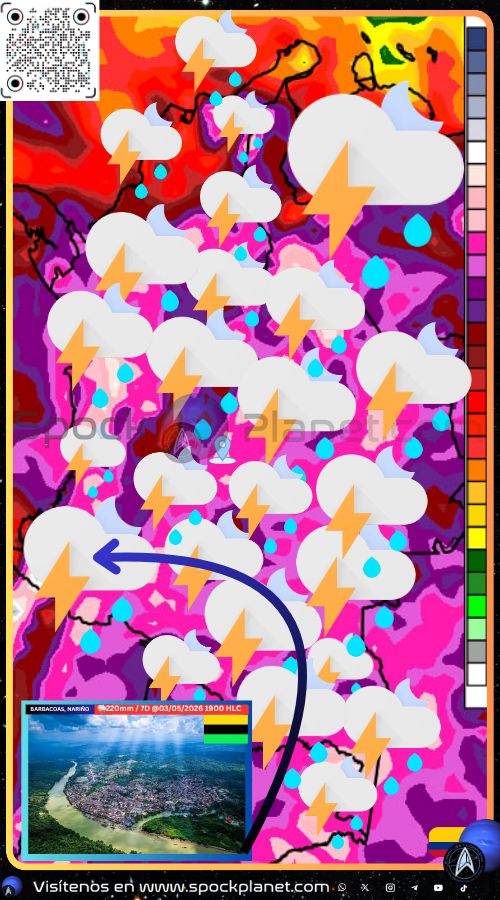 La zona con mayores acumulados a nivel nacional sería los alrededores de Barbacoas en Nariño con hasta 220 mm de pluviosidad.