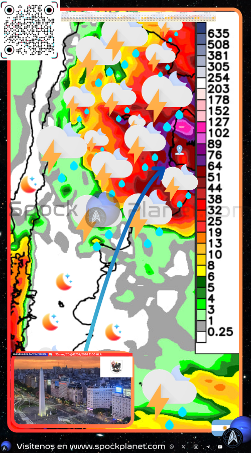 La zona con mayores acumulados a nivel nacional sería la ciudad autónoma de Buenos Aires en la provincia de Buenos Aires con hasta 70mm de pluviosidad.